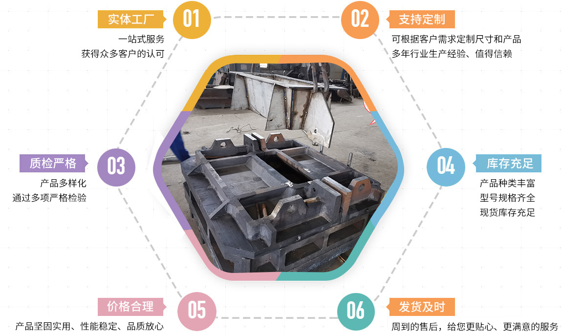 主要產品有:鋼筋壓塊,廢舊剪切料、礦山及水泥機械配件、鐵路機械及工務配件、電解鉛陽極板、母模、粗銅模、陽極模、渣包等。